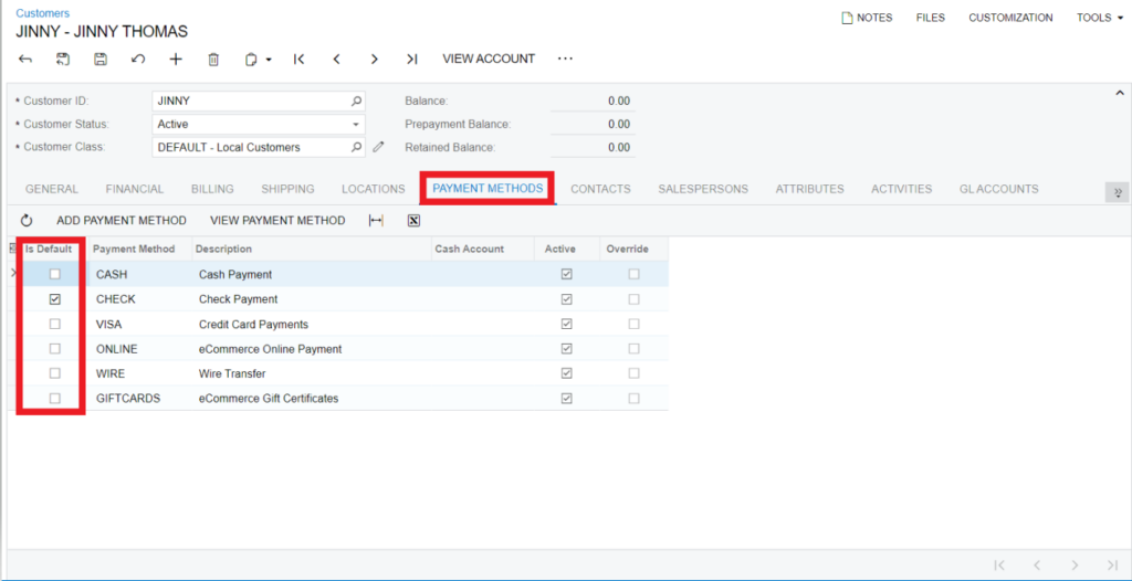 Step 8: In Payment Methods tab select any one of the payments as the default payment method. Then on the form toolbar click on Save.
