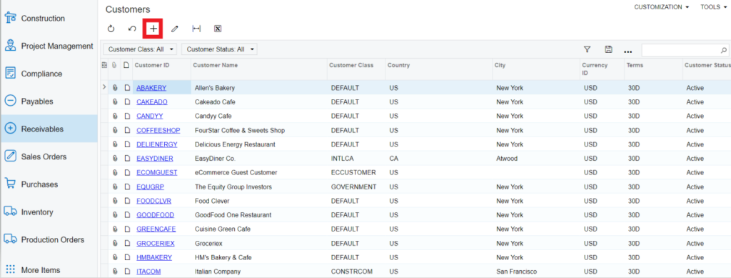 Then under Profiles category select Customers (AR303000) form and open it. After opening the form on the form toolbar click Add New Record button.