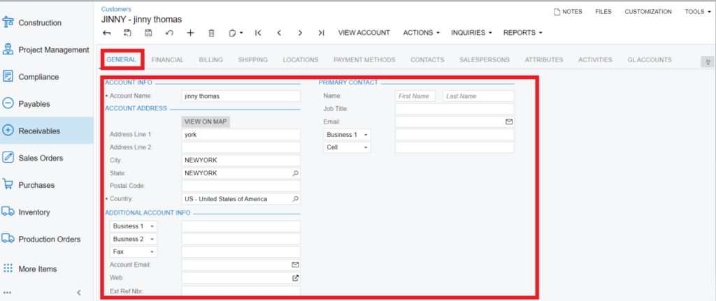 Step 3: In General tab, specify the customer’s name which can be the Trade name and specify Address, Phone number, Primary contact as needed.
