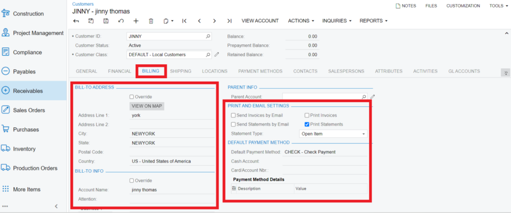 Step 5: In Billing Tab specify Bill-To address and contact information, select preferred Print and & Email Settings section, Payment method is default from customer class.