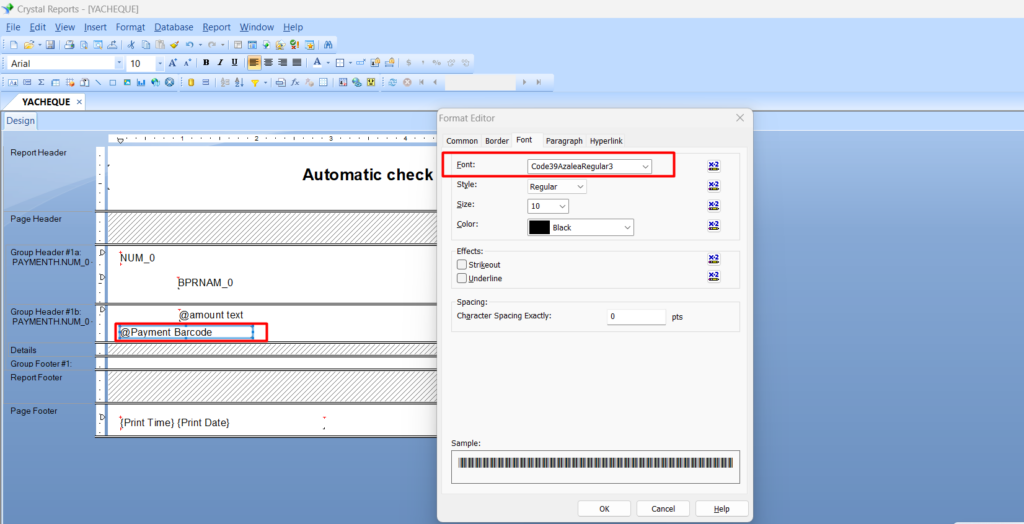 Step 5: Next, add that formula in the report, and we must add font type as ‘Code39AzaleaRegular3’ in the Format editor of that field and save the report. Refer to Screenshot 5.