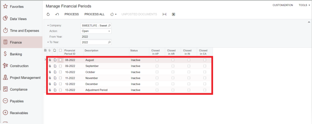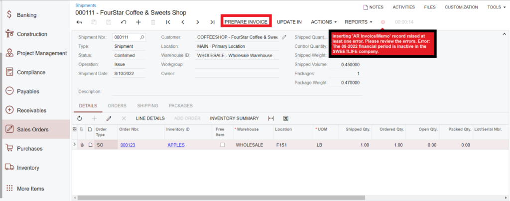 While trying to create the invoice from the Shipments (SO302000) form, the following error might occur “Inserting ‘AR Invoice/Memo’ record raised at least one error. Please review the errors. Error: The 08-2022 financial period is inactive in the SWEETLIFE company”