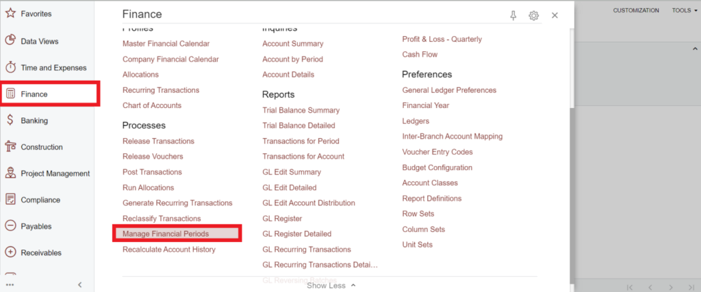 Under Processes category select Manage Financial Periods (GL503000) form.