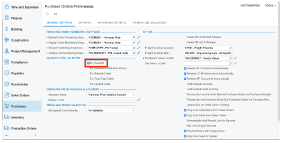 1. Redirect to the Purchases from the main menu, open the Purchase Order Preferences (PO101000) form, and head to the “Validate Total on Entry section.