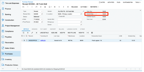 4. Click “Enter PO Receipt.” Save it.