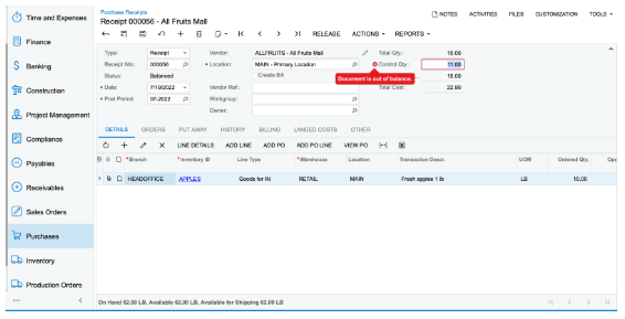 5. Since the Purchase Receipt amount needs to be validated, enter the total document quantity in the “Control Qty” box and save it.